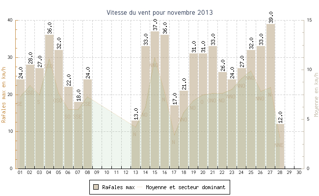 | 30 | 4.7 °C | 10.6 °C | 7.1 °C | 9.8 km/h (38.0 km/h) | NNO |